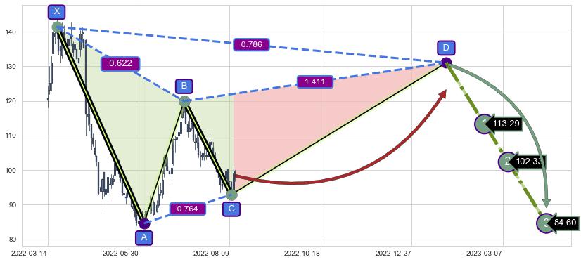 ➣ 未完成【伽利】形态起点X: 2022-03-21, 已到达C点: 2022-08-10, 预测最终D点: 2023-01-23, 共214交易日