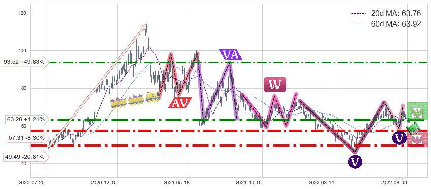 ♘ 阻力价格位63.26,可信任强度86.13%,距离最后交易2022-08-12形成的收盘价格62.50相差 +1.21%