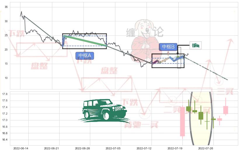 ➣ 【中枢B】:2022-05-24-2022-08-01,中枢由6笔构成,共49交易日, ZG=16.06, ZD=15.93