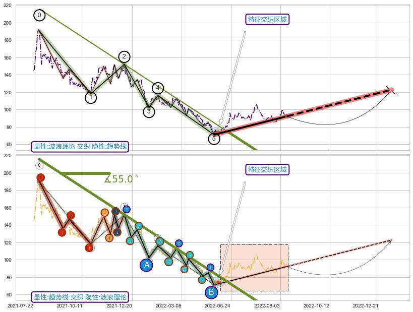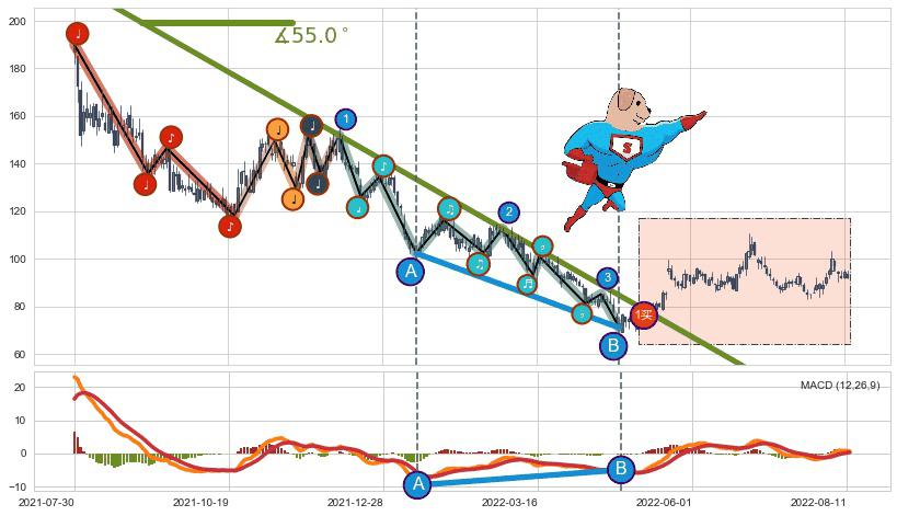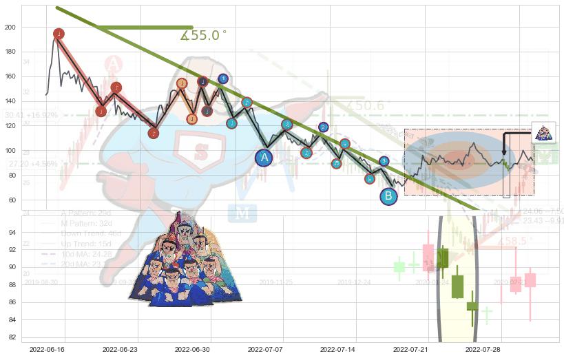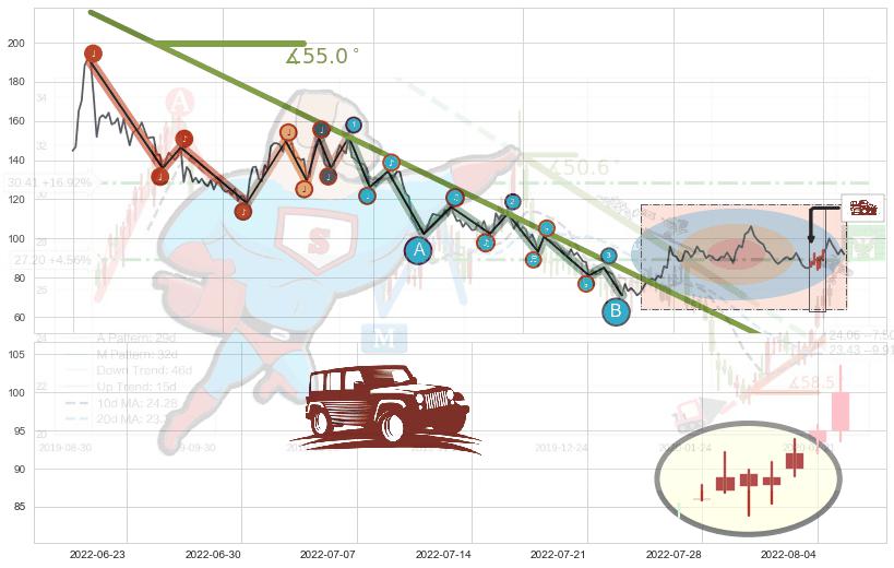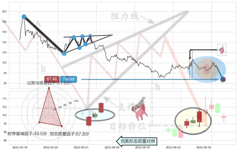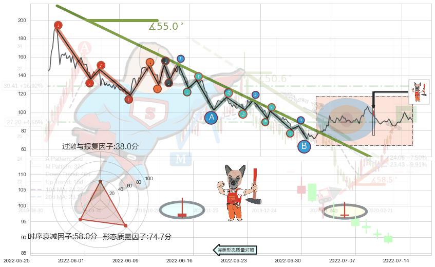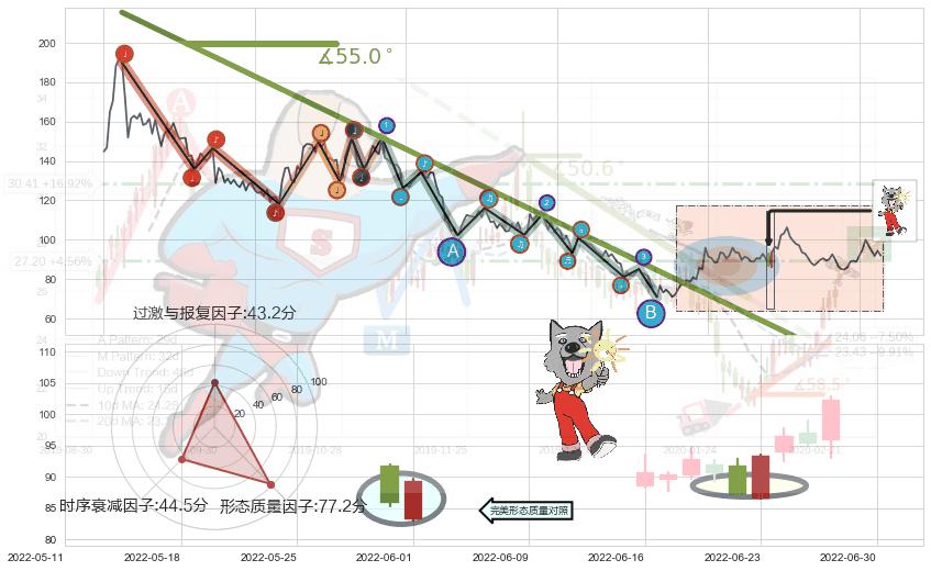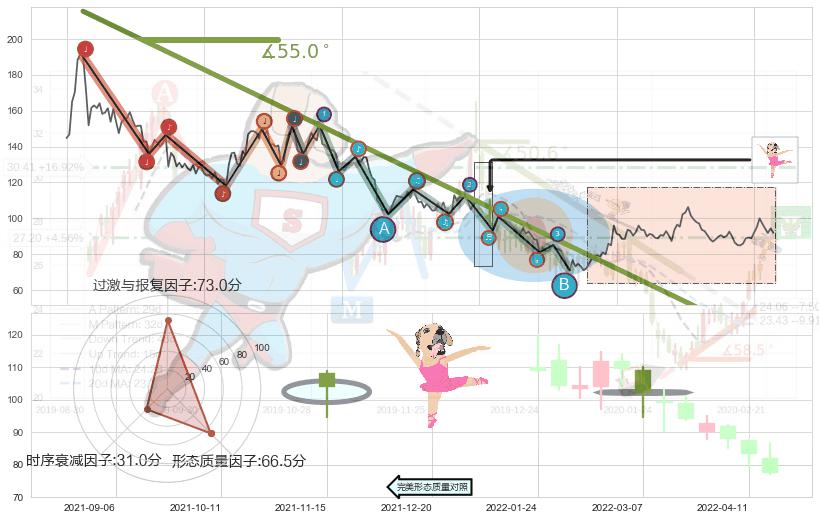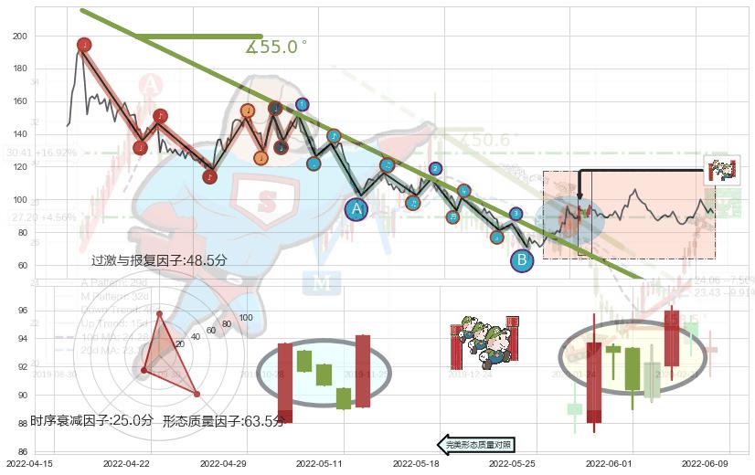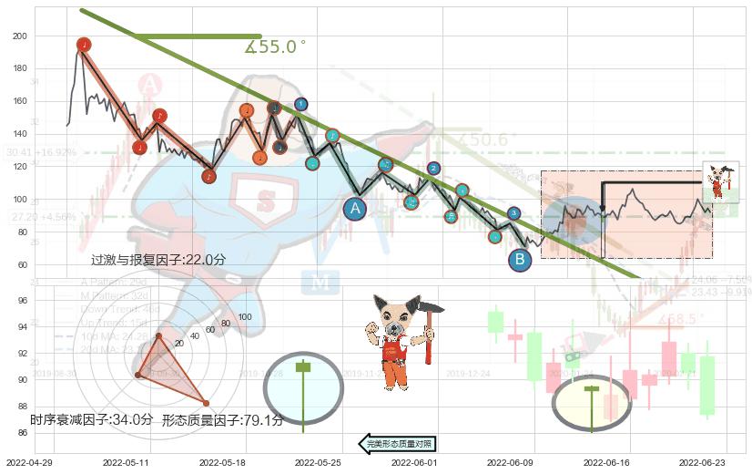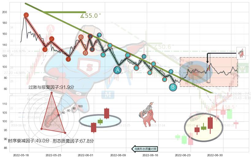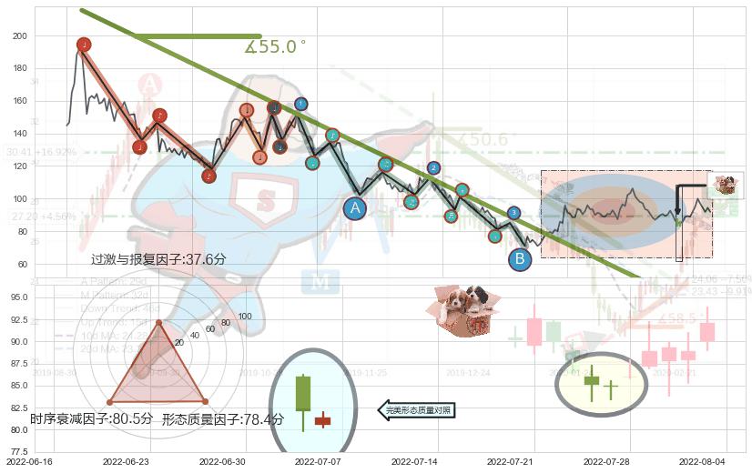 从2021-07-30至2022-05-20,共包含193个交易日,阶段股价下跌-67.76%,阶段股价变动位移路程比: 1 : 7,下跌趋势角度: 55.0