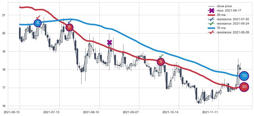 ➣ 35小时均线于(2022-07-21: 14.09)形成【死叉】基于【死叉历史模型】预测死叉后最低波谷价格: 12.49, 死叉后最低价格12.76,尚未达到预测最低波谷价格, 预期继续下跌