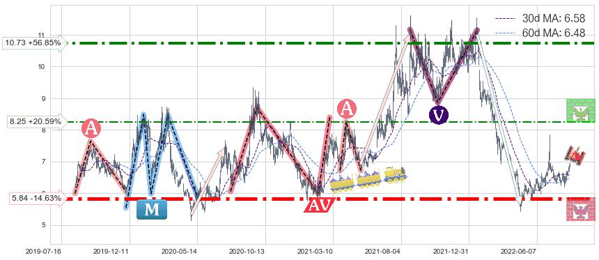 ♘ 支撑价格位5.84,可信任强度96.76%,距离最后交易2022-08-12形成的收盘价格6.84相差 -14.63%