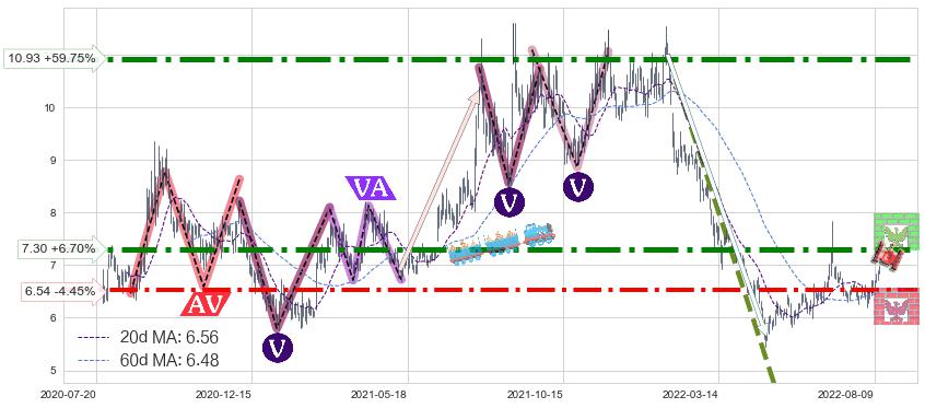 ♘ 阻力价格位7.30,可信任强度86.75%,距离最后交易2022-08-12形成的收盘价格6.84相差 +6.70%