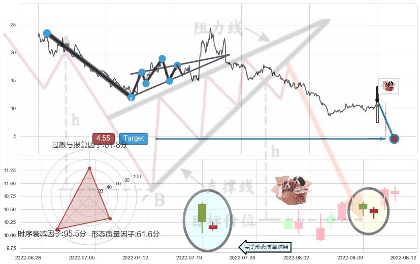 从2021-08-03至2022-06-17,共包含210个交易日,阶段股价下跌-77.90%,阶段股价变动位移路程比: 1 : 5,下跌趋势角度: 46.0