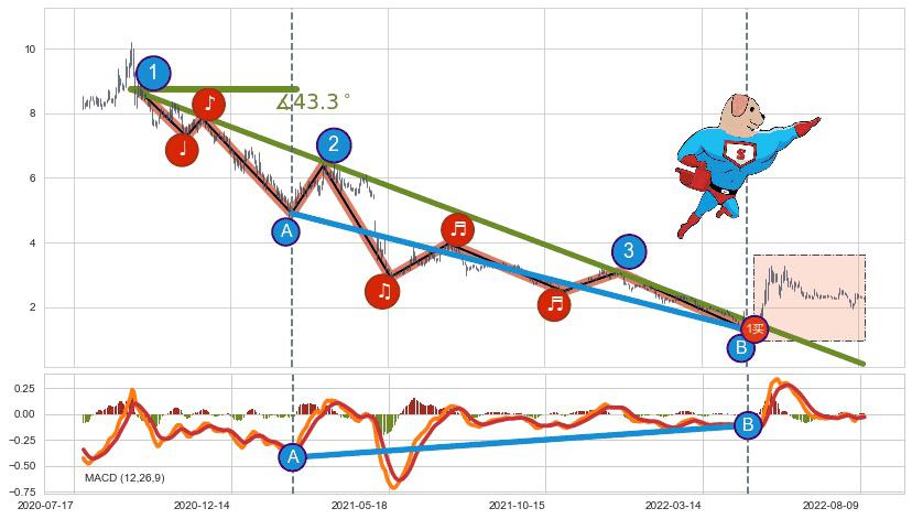 ➣ 【MACD】缠论走势出现【常规背离 & 反转信号】背离程度99.00%,背离夹角角度89.3˚,背离程度较大