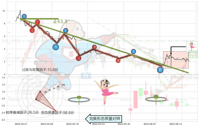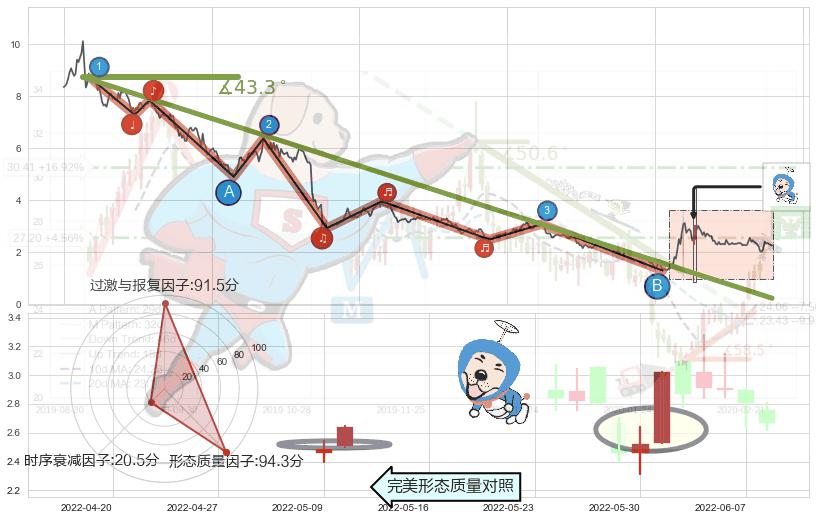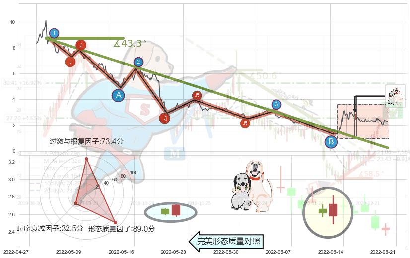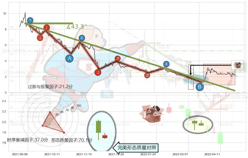 从2020-09-08至2022-05-19,共包含407个交易日,阶段股价下跌-87.64%,阶段股价变动位移路程比: 1 : 11,下跌趋势角度: 43.3