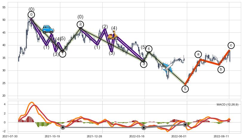 ➣ 波浪理论:猜想达到c点后小反弹终止反转下跌 → 下跌 → 【拐点】临近 → 阶段均值回复结束后继续大周期趋势跟踪