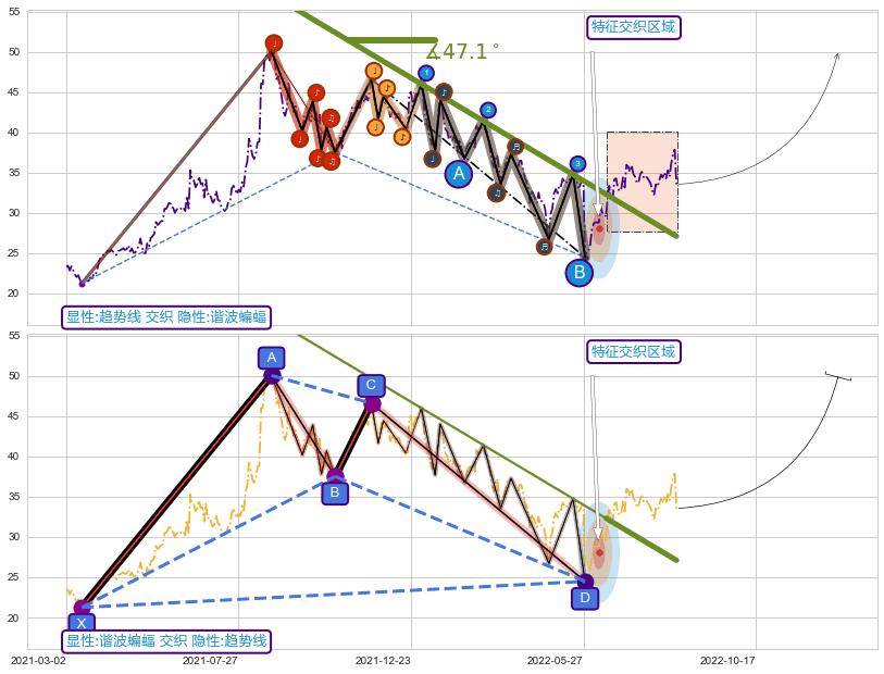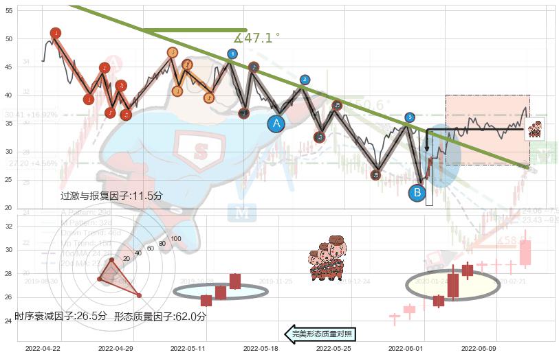 从2021-08-23至2022-06-16,共包含195个交易日,阶段股价下跌-38.86%,阶段股价变动位移路程比: 1 : 12,下跌趋势角度: 47.1,2022-05-30向↘︎形成缺口,跳空下跌-27.95%˚