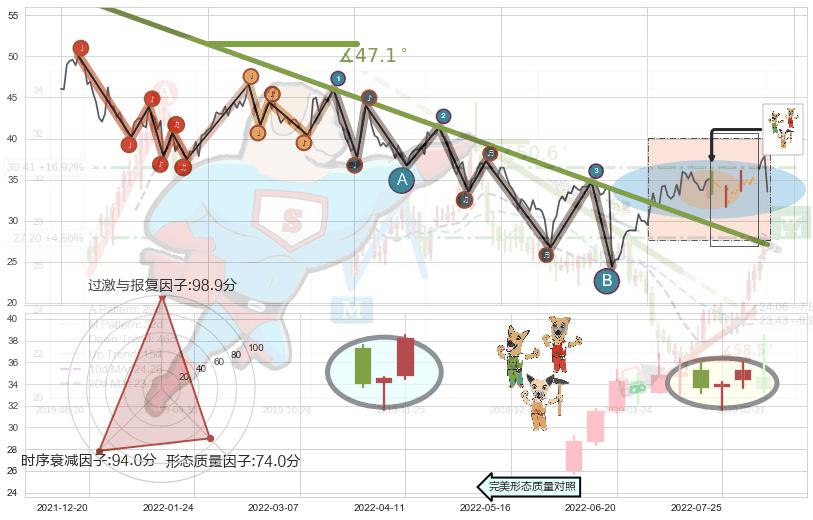 ➢ 2021-08-23-2022-06-16下跌趋势存在反转上涨[机会],其原下跌趋势的阻力位(27.09)已被突破[强支撑信号],原下跌趋势角度: 47.1˚