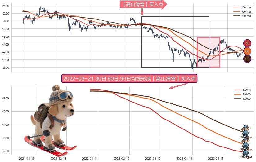 ⚀ 2022-01-04日-2022-06-02日显现 30日-60日-90日均线 【高山滑雪】买入点 看多信号,后市看涨,买入
