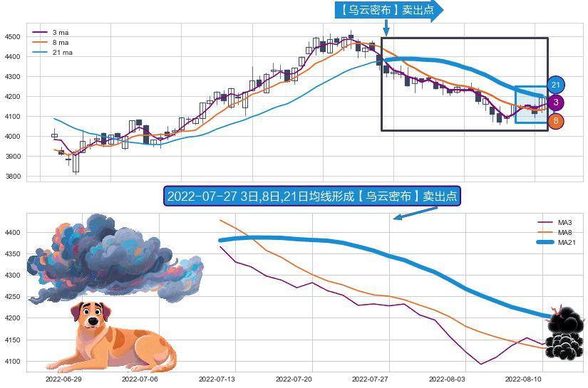 ⚀ 2022-07-12日-2022-08-11日显现 3日-8日-21日均线 【乌云密布】卖出点 看空信号,后市看跌,卖出