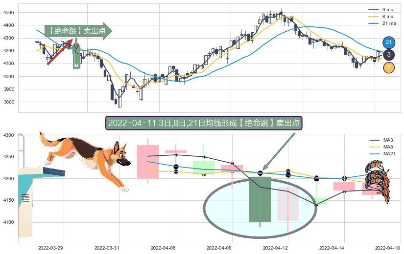 ⚀ 2022-04-11日显现 3日-8日-21日均线 【绝命跳】卖出点 看空信号,后市看跌,卖出