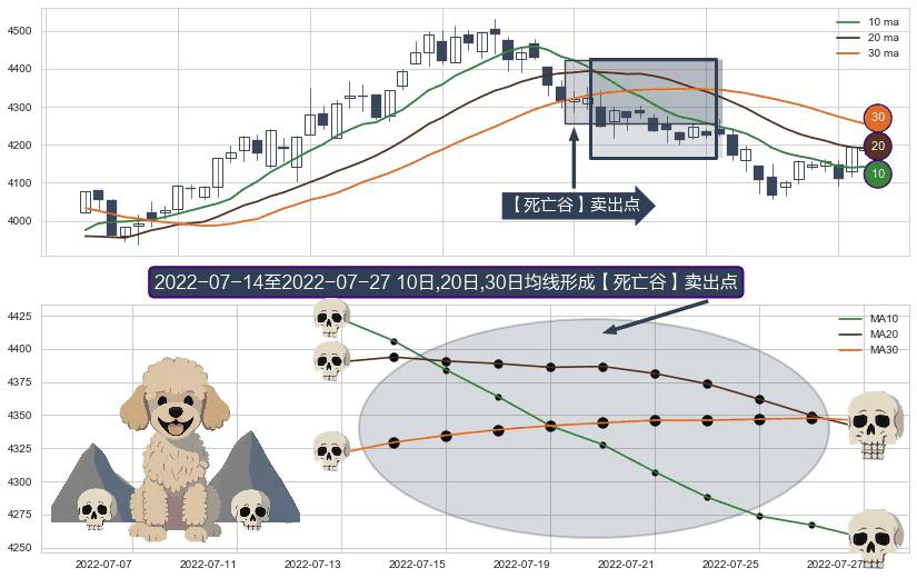 ⚀ 2022-07-15-日至2022-07-27-日显现 10日-20日-30日均线 【死亡谷】卖出点 看空信号,后市看跌,卖出