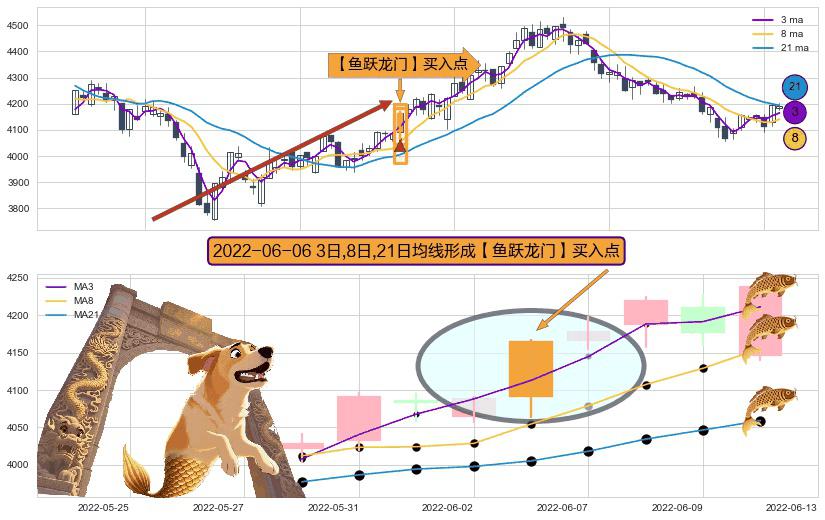 ⚀ 2022-06-06日显现 3日-8日-21日均线 【鱼跃龙门】买入点 看多信号,后市看涨,买入