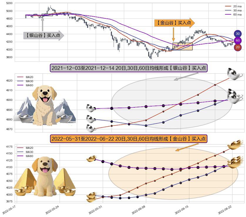 ⚀ 2022-06-01-日至2022-06-22-日显现 20日-30日-60日均线 【金山谷】买入点 其再次确认了买入信号,可靠性更强,买入