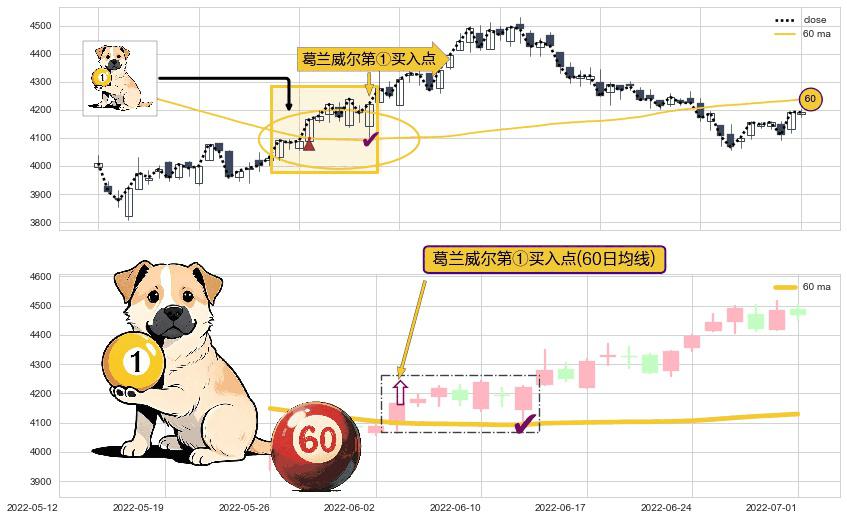 ⚀ 2022-06-06-日显现 葛兰威尔均线 60日均线 第买①入点 走势反转见底信号,后市看涨,买进信号