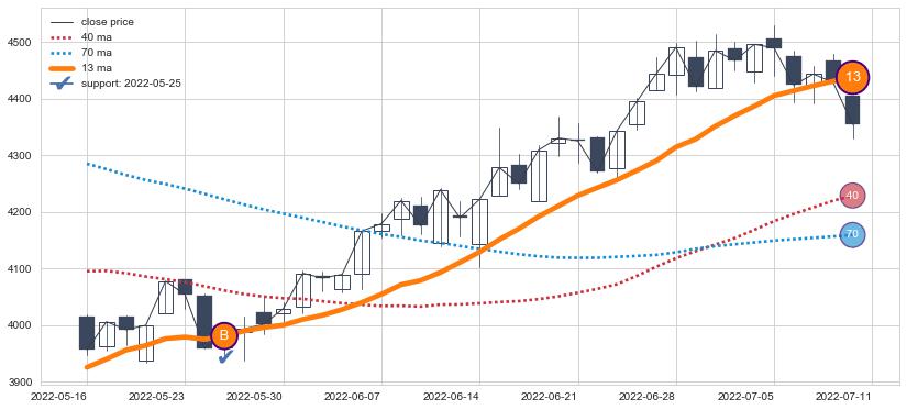 ⚁ MA3和MA8走势平行,且始终保持在短距离内,MA21始终在短中期均线上方,与短中期均线保持一定的距离,微微下行