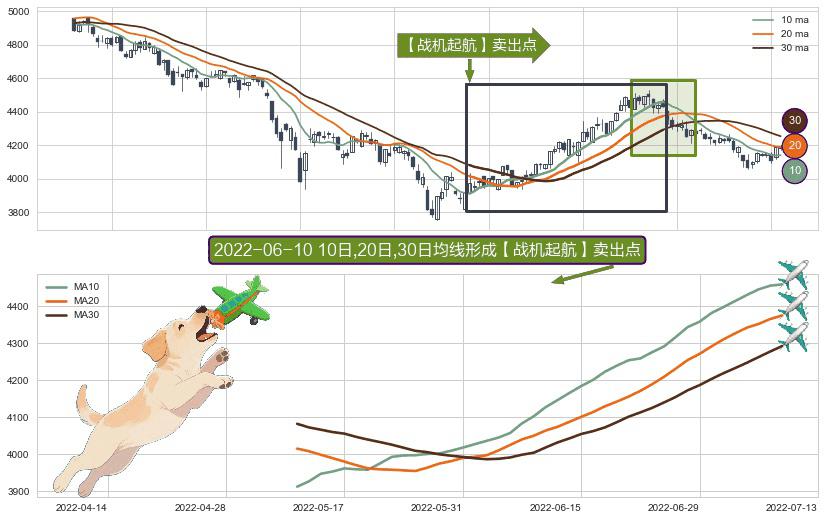 ⚀ 2022-05-11日-2022-07-08日显现 10日-20日-30日均线 【战机起航】卖出点 看空信号,后市看跌,卖出