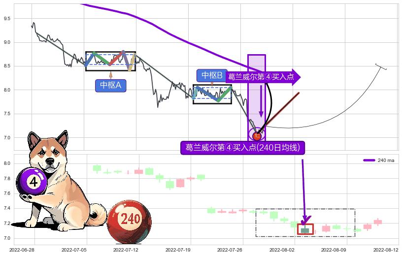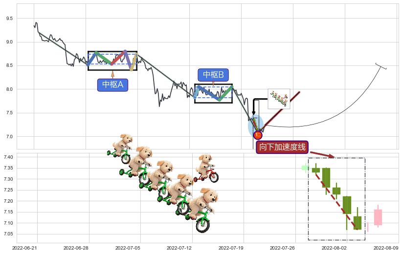 ➣ 【中枢B】:2022-05-09-2022-06-29,中枢由4笔构成,共37交易日, ZG=8.05, ZD=7.82