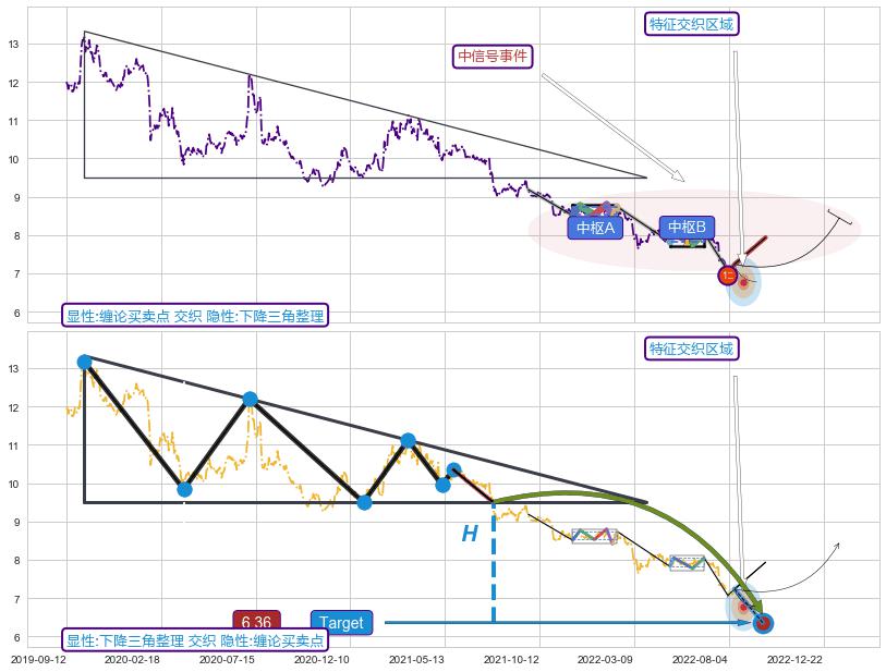 ➢ 【中枢A】:2021-11-30-2022-02-11,中枢由6笔构成,共48交易日, ZG=8.74, ZD=8.53