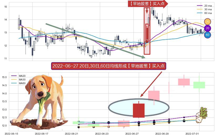 形态多维评估: ⚀ 2022-06-27日显现 20日-30日-60日均线 【旱地拔葱】买入点 看多信号,后市看涨,买入