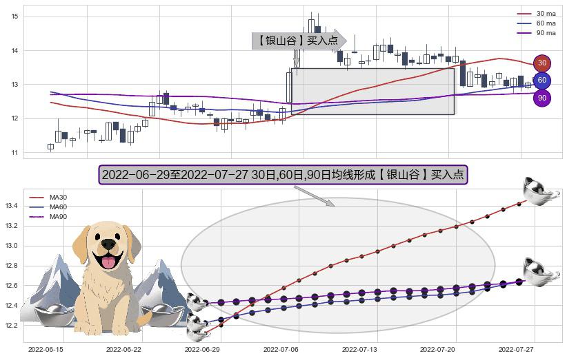 形态多维评估: ⚀ 2022-06-30-日至2022-07-27-日显现 30日-60日-90日均线 【银山谷】买入点 看多信号,后市看涨,买入
