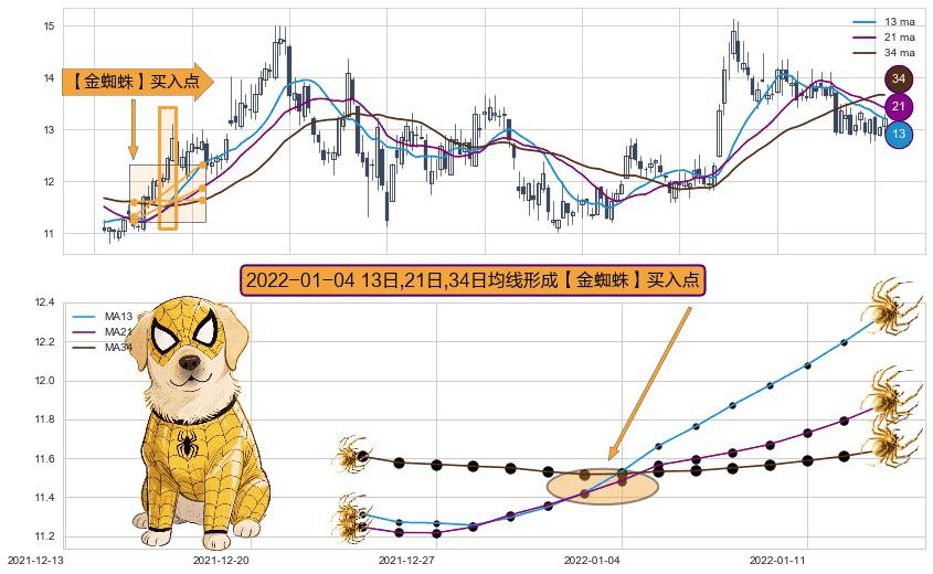 形态多维评估: ⚀ 2022-01-04日显现 13日-21日-34日均线 【金蜘蛛】买入点 看多信号,后市看涨,买入