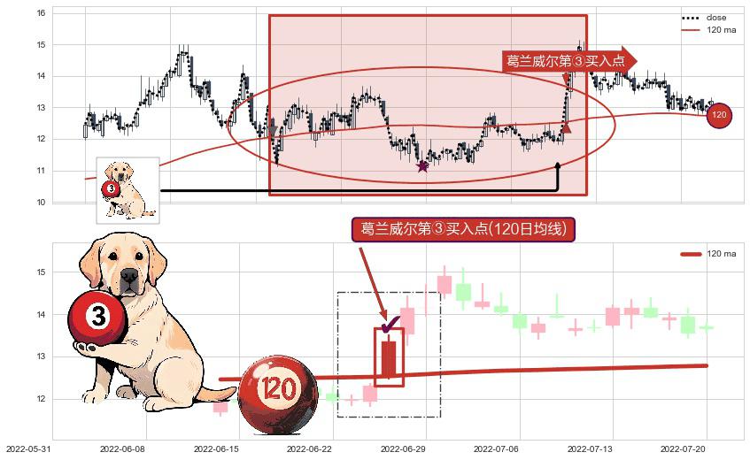 形态多维评估: ⚀ 2022-06-27-日显现 葛兰威尔均线 120日均线 第③买入点 上升趋势的中继信号,后市看涨,买进信号