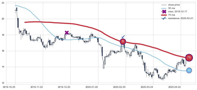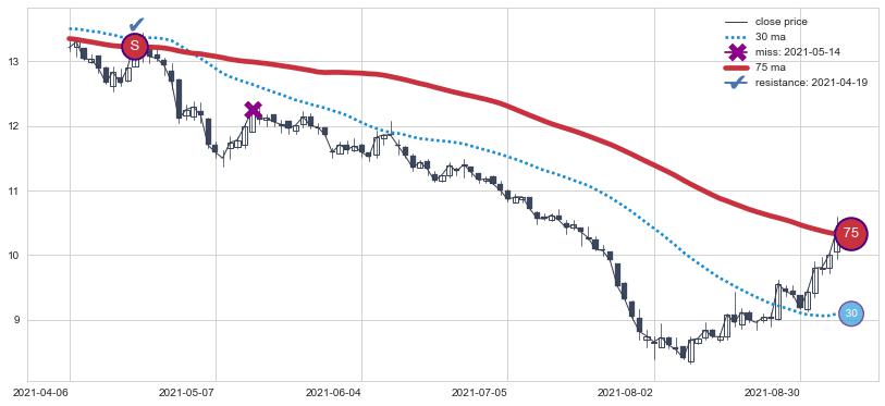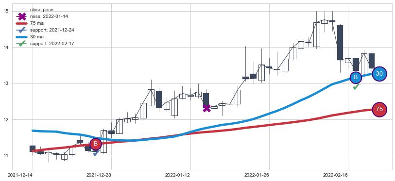 上涨趋势2021-12-14-2022-02-21,均线75, 30确认关键支撑2处