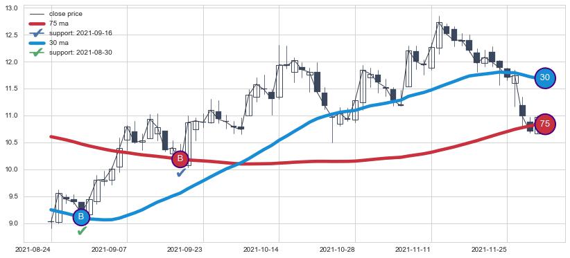 上涨趋势2021-08-24-2021-12-01,均线75, 30确认关键支撑2处
