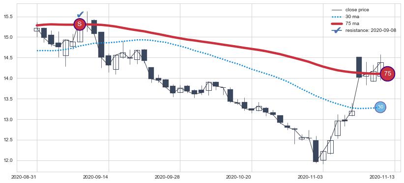 下跌趋势2020-08-31-2020-11-13,均线75确认关键阻力1处