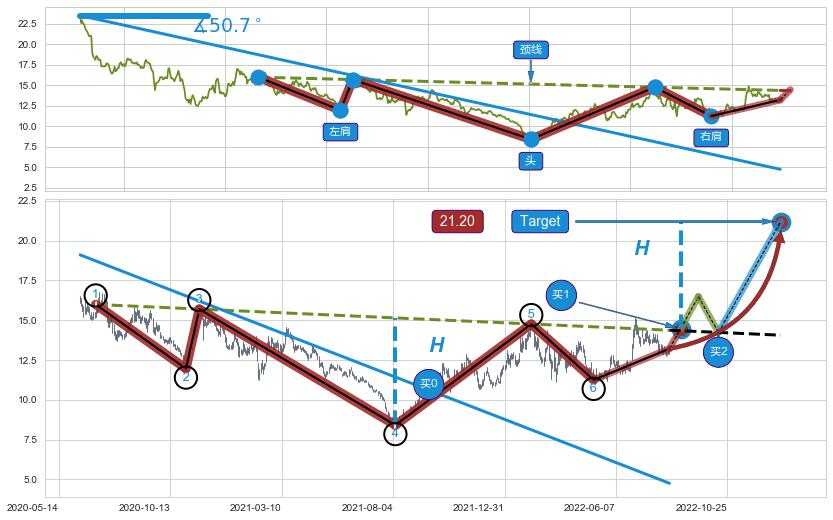 ➣ 最小反转涨幅→𝐇: 6.74 (头部与颈线垂直距离)