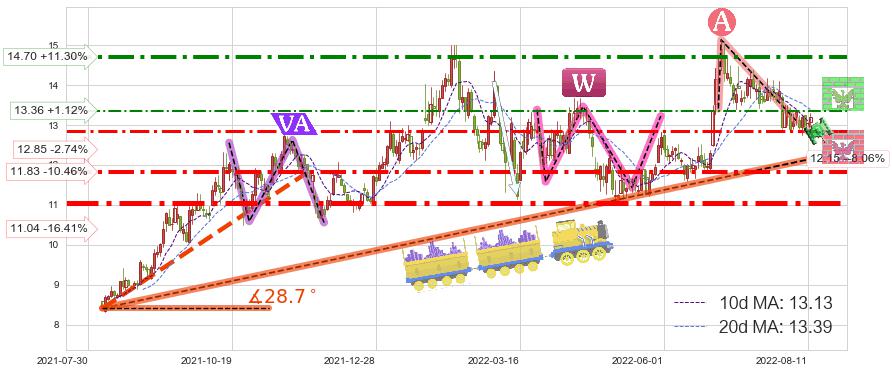 ♘ 阻力价格位13.36,可信任强度54.93%,距离最后交易2022-08-12形成的收盘价格13.21相差 +1.12%