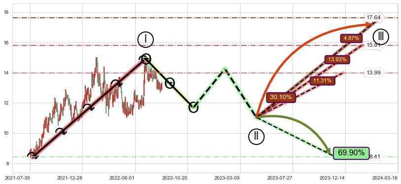 ➢ 循环浪继续向上【最低】位置(2023-12-08, 13.99),匹配聚类样本比例37.56%, 可能性概率11.31%