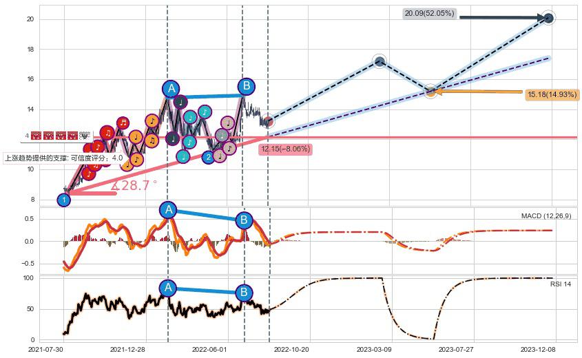 ♘ 阻力价格位14.70,可信任强度77.65%,距离最后交易2022-08-12形成的收盘价格13.21相差 +11.30%