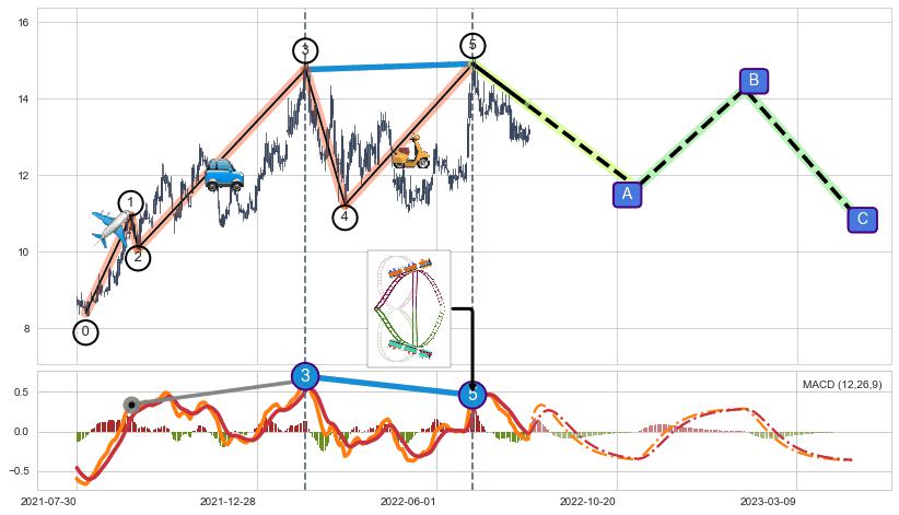 ➣ 第一, 三, 五浪上涨动能逐渐【衰弱变小】,趋势呈现不稳迹象