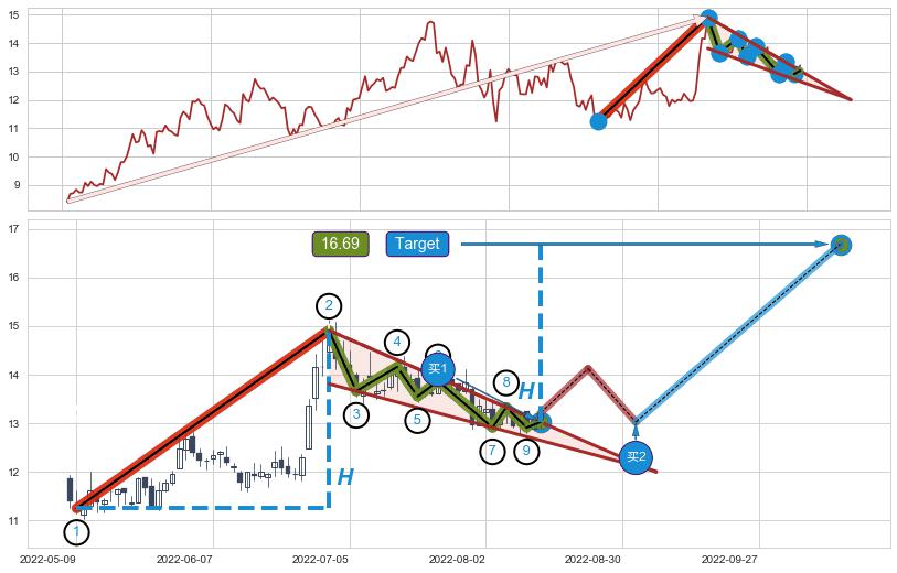➢ 收盘价(2022-07-14: 14.16 )→回踩→第一根k线低点(2022-07-08: 13.92 )