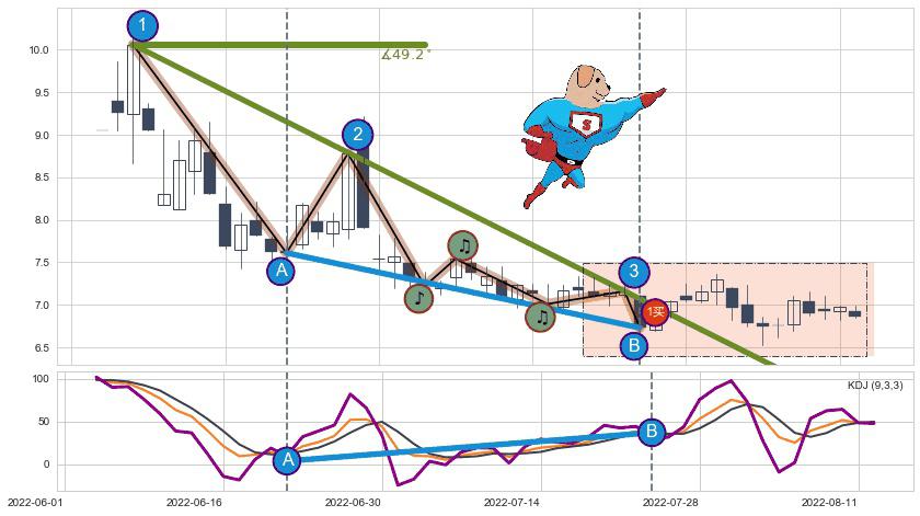 从2022-06-08至2022-07-29,共包含38个交易日,阶段股价下跌-30.26%,阶段股价变动位移路程比: 1 : 4,下跌趋势角度: 49.2