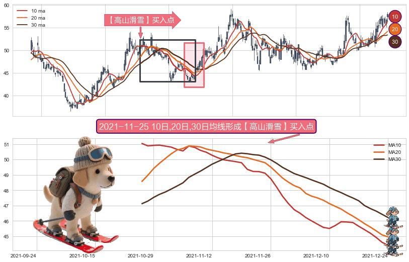 ⚀ 2021-10-27日-2021-12-24日显现 10日-20日-30日均线 【高山滑雪】买入点 看多信号,后市看涨,买入