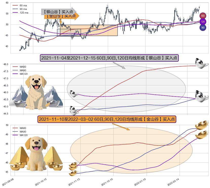 ⚃ 2021-11-11-日至2022-03-02-日显现 60日-90日-120日均线 【金山谷】买入点 其再次确认了买入信号,可靠性更强,买入