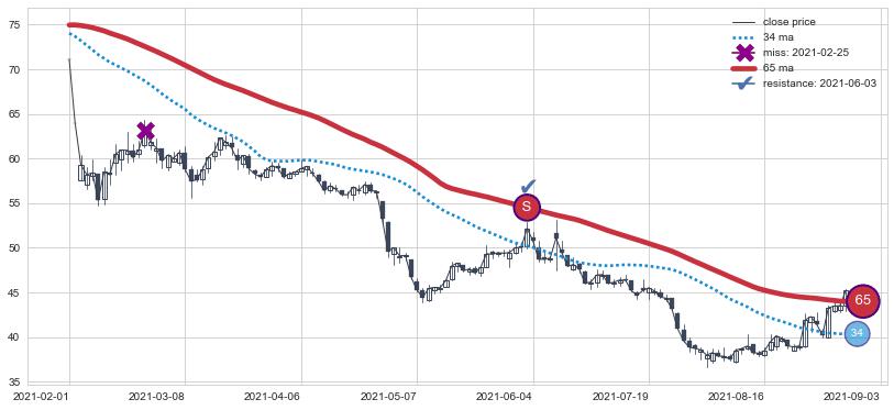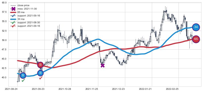⚅ 买点向上突破均线后,价格走势有持续向上的迹象,但动能稍显不足,迟迟不能远离均线