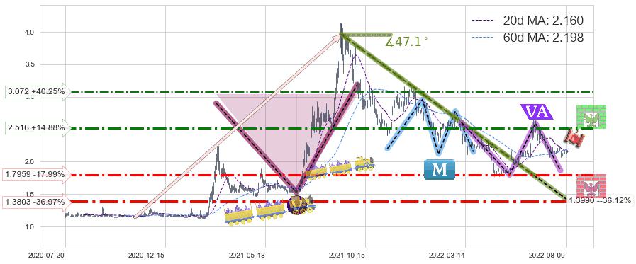 ♘ 阻力价格位3.072,可信任强度53.21%,距离最后交易2022-08-12形成的收盘价格2.190相差 +40.25%