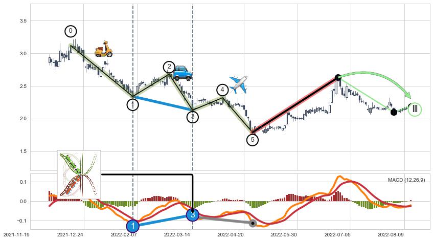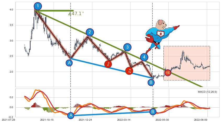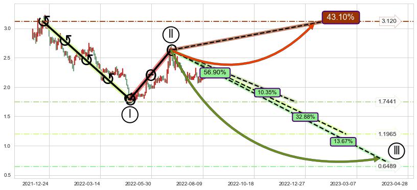 ➣ D点拟合预测价格0.6056,距离最后交易收盘价格2.190相差 -72.35%