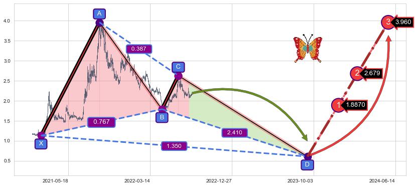 ➣ 未完成【蝴蝶】形态起点X: 2021-02-01, 已到达C点: 2022-06-27, 预测最终D点: 2023-09-12, 共645交易日