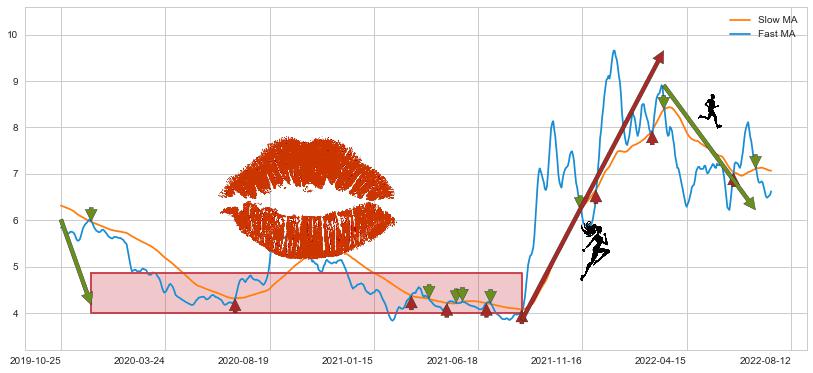 2022-03-14至2022-07-22 慢线与快线呈空头排列, 慢线与快线接触少,无缠绕