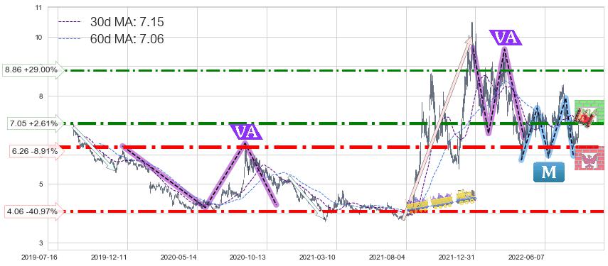 ♘ 阻力价格位7.05,可信任强度81.41%,距离最后交易2022-08-12形成的收盘价格6.87相差 +2.61%