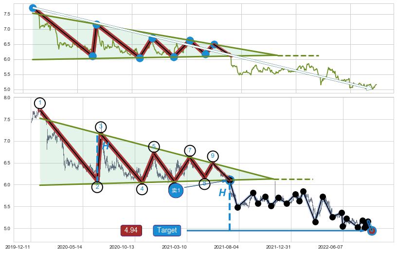➣ 【未确认突破,预测即将形成突破】下降三角形整理起点:2021-05-25, 预测突破点:2022-08-11,形态共298交易日