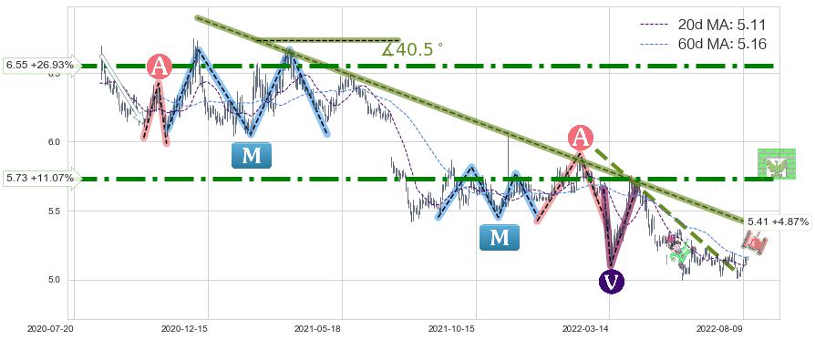 ♘ 阻力价格位5.73,可信任强度95.21%,距离最后交易2022-08-12形成的收盘价格5.16相差 +11.07%