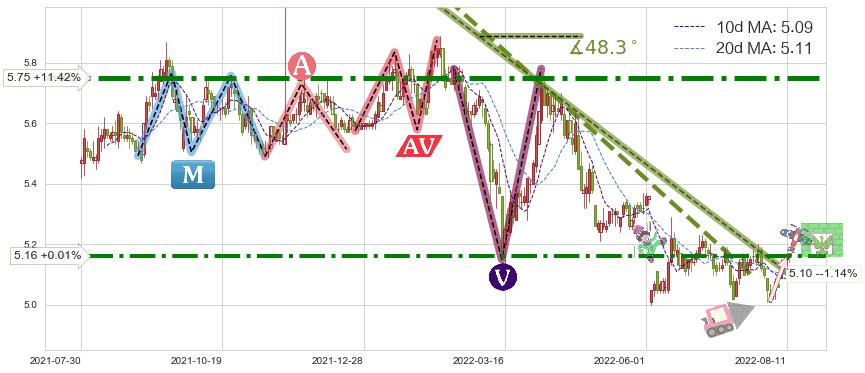 🦴 长线均值回复组合短线趋势跟踪[强阻力信号]2022-01-13-2022-08-11下跌趋势依然成立(下跌趋势跟踪依然存在),短线价格略微上行反弹(均值回复猜想),即将接近下跌趋势提供的未破位阻力价格:5.10。
