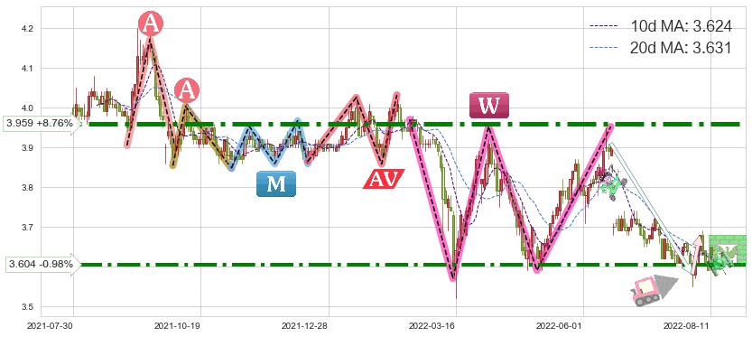 ♘ 阻力价格位3.604,可信任强度73.51%,距离最后交易2022-08-12形成的收盘价格3.640相差 -0.98%